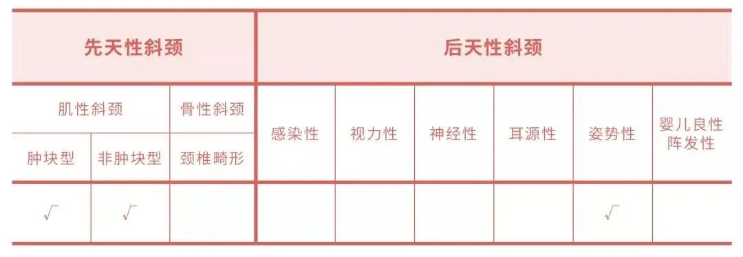 小兒斜頸分成先天性和后天性?xún)纱箢?lèi),具體詳見(jiàn)下列表格: